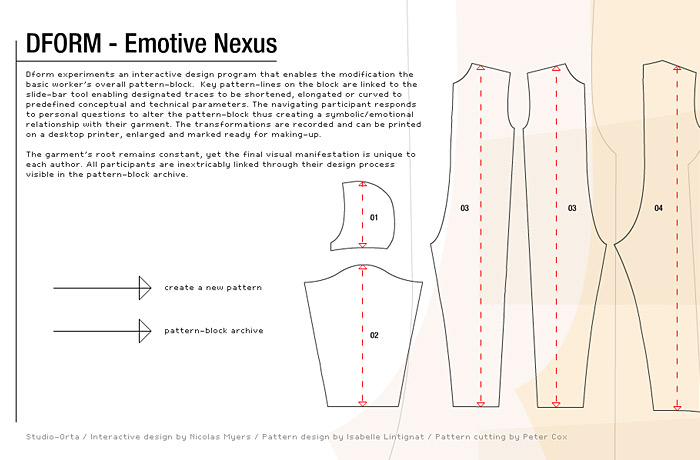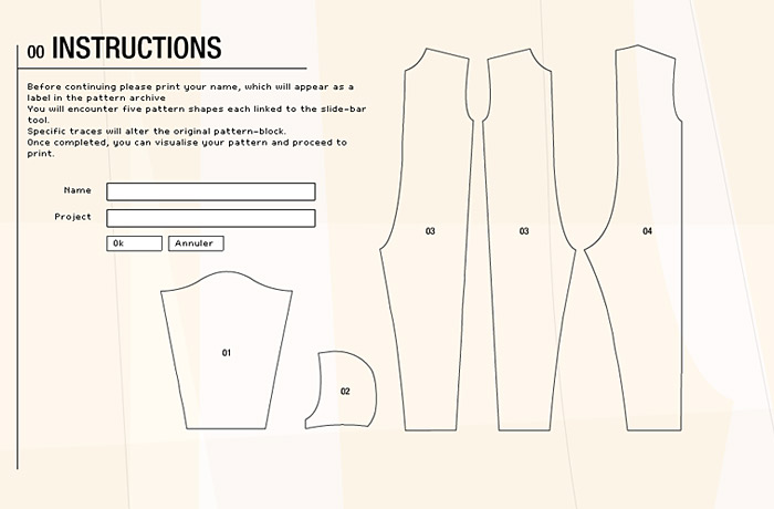D-Form is an interactive tool to draw and transform clothes patterns according to users’ answers. This web site was designed in collaboration with Lucy Orta to be used in a workshop by fashion students. The idea is to produce real clothes which will reflect their personality via a questionnaire.